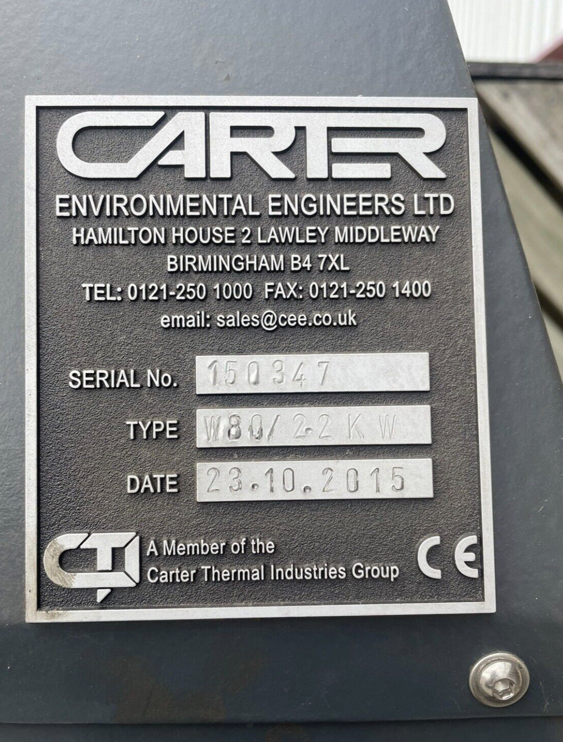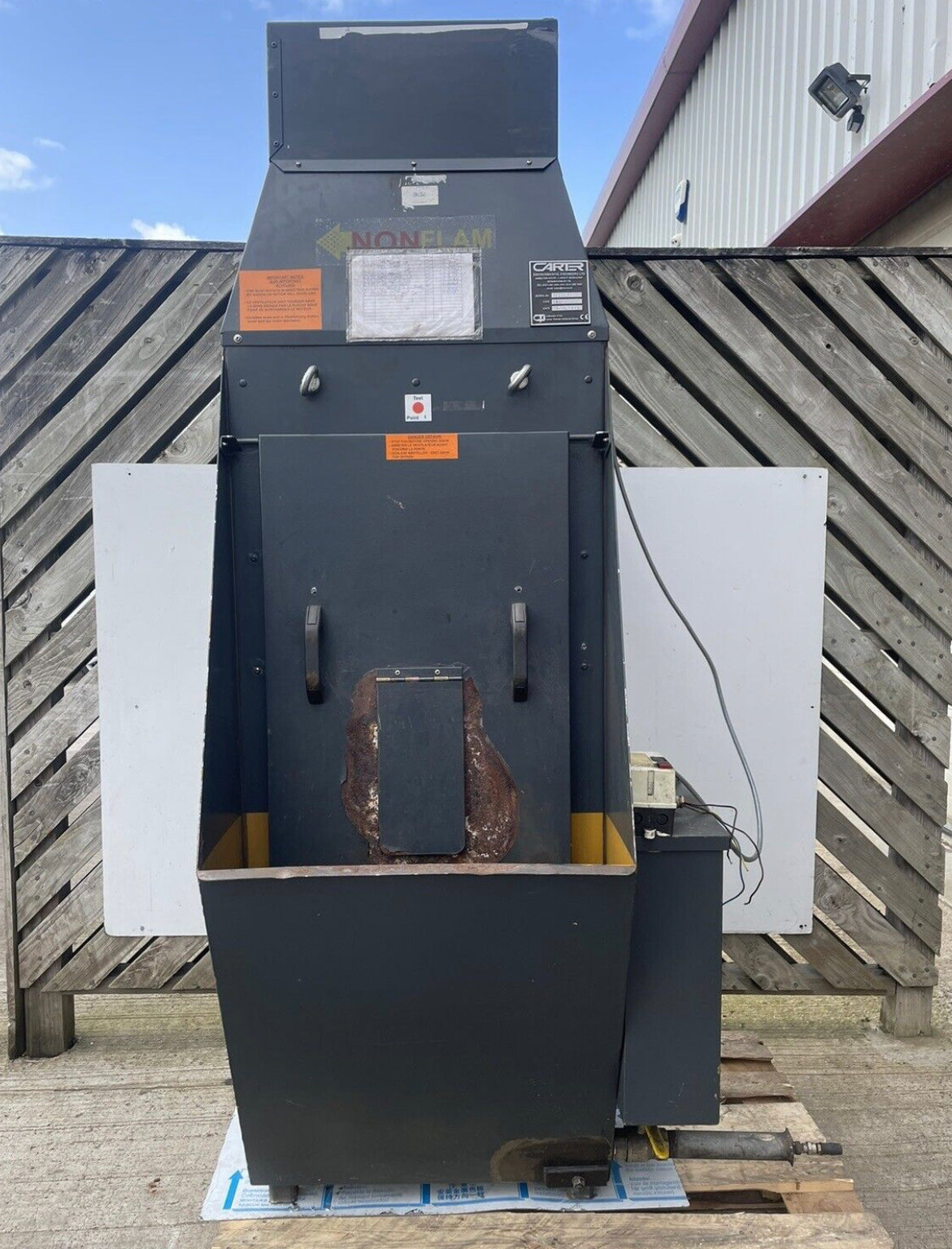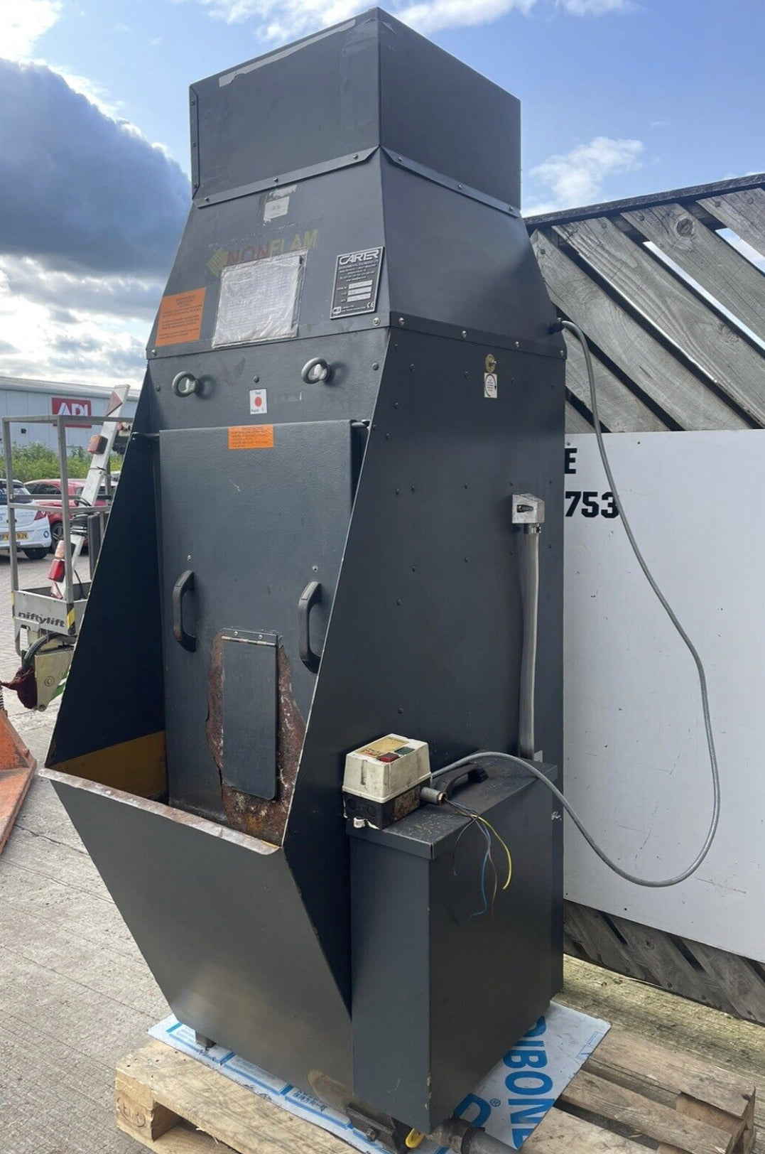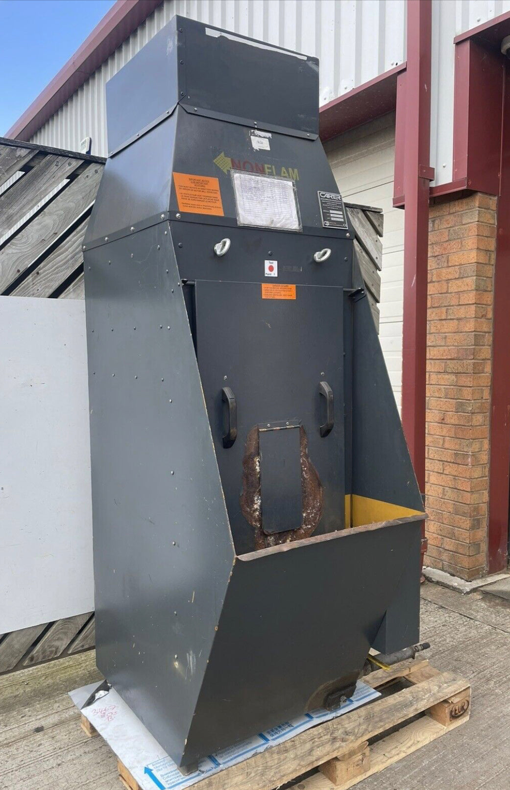 The carter system is a water filter unit, this means its an anti fire system catching any combustible metals, catching fire as well as keeping air born materials at bay. It has a drain system on the side where water can be changed and a handy level pipe so you can top up as needed, it is in good working order with 3 phase power supply.